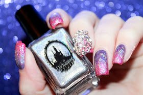 I started by making a gradient between "Princess Parking Only" and "Beauty Queen", then I added some glitter with the holographic top coat "Rainbow Pulp (with juice)" from Enchanted Polish.